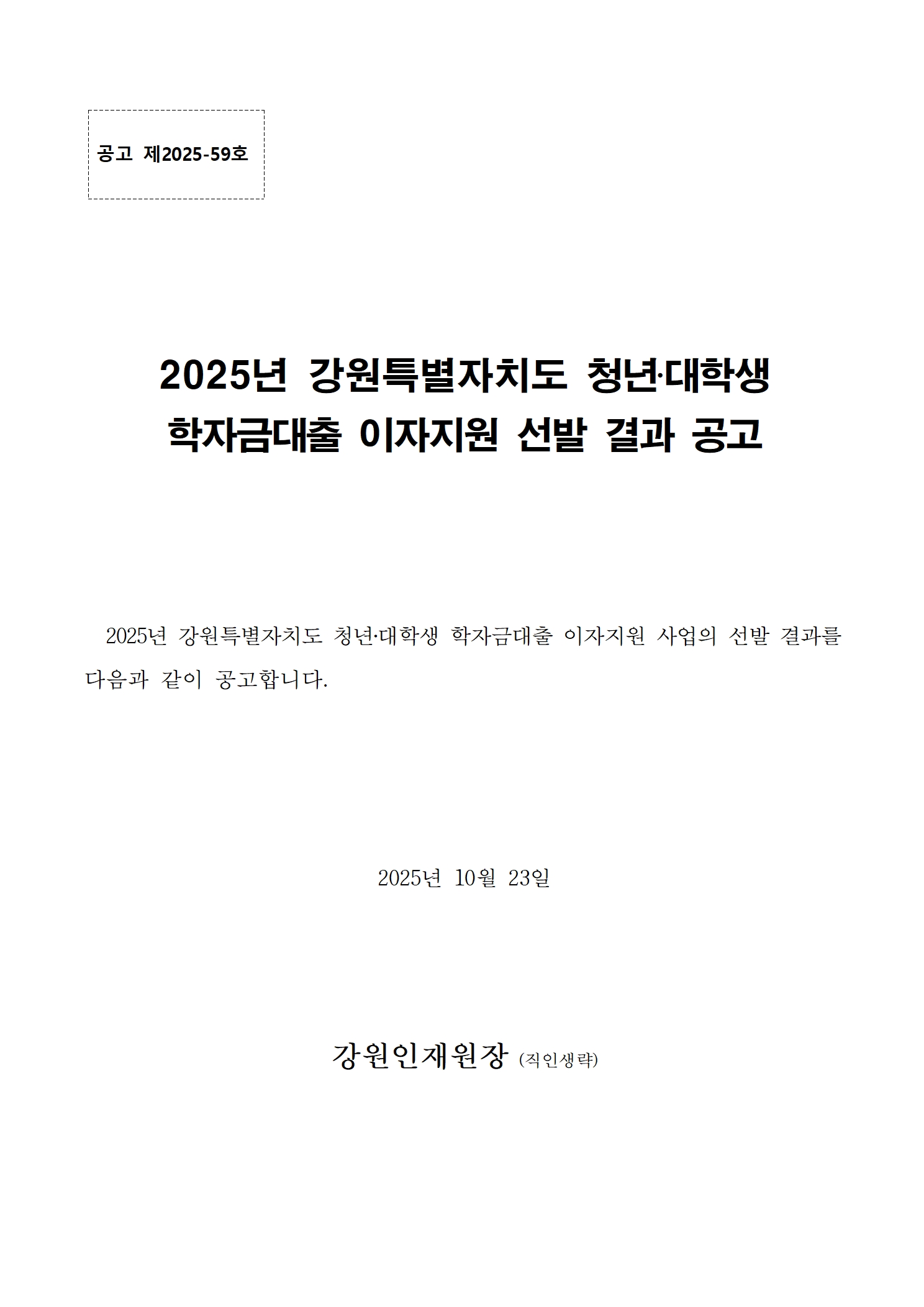 2025년 강원특별자치도 청년‧대학생 학자금대출 이자지원 선발 결과 공고
