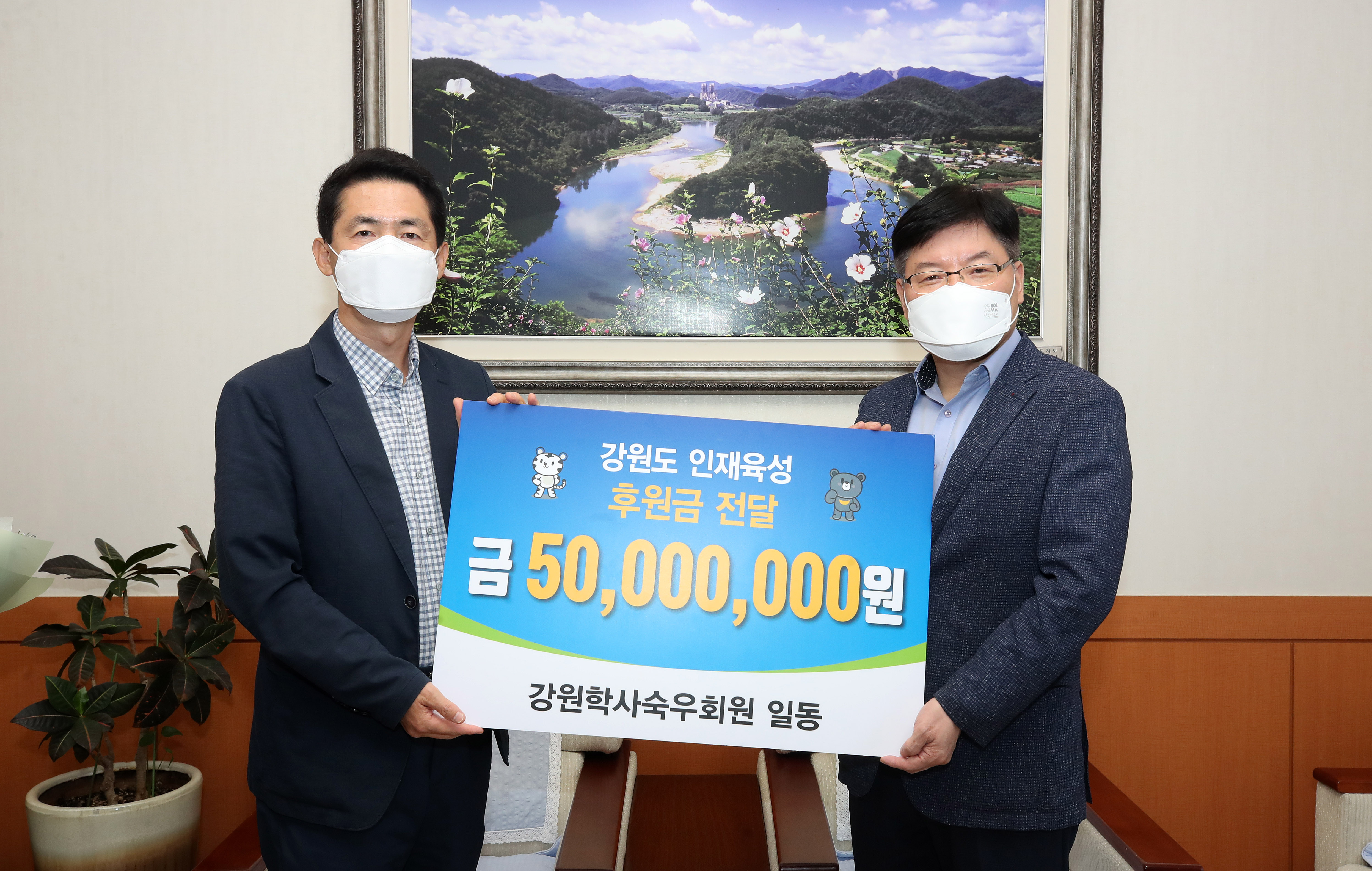 10월 6일, 강원인재육성을 위한 후원금 5,000만원을 재단에 기탁하였습니다.(좌 강원학사숙우회장, 우 강원도행정부지사)