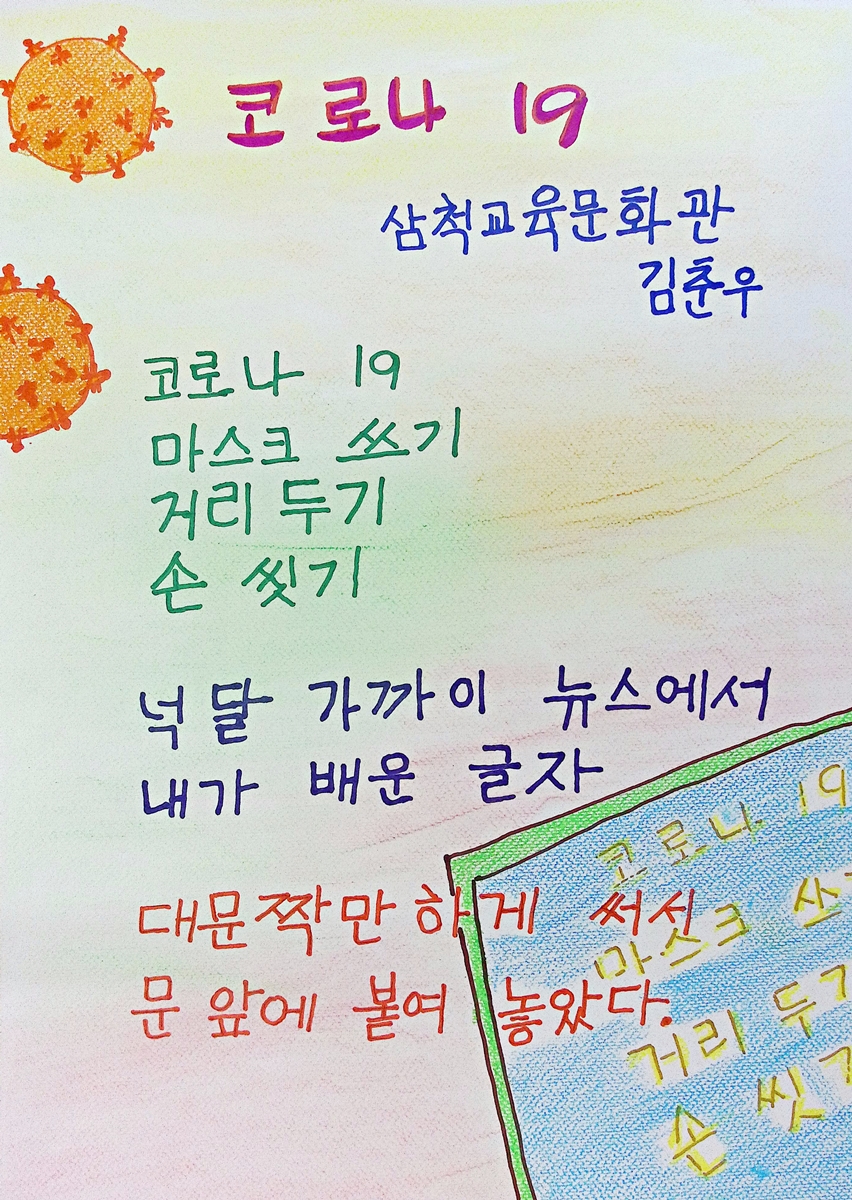 학우들과 비교하면 항상 뒤처져 주눅 들었고 통학 40분으로 힘들어했지만 담임 선생님의 응원으로 공부를 계속했습니다. 힘들어하는 김춘우 학습자에게 담임 선생님이 알려준 공부법은 문 앞에 오늘 배운 것을 적어 두고 나갈 때마다 보면서 복습하는 것 입니다. 꾸준히 이 방법으로 단어를 외운 김춘우 학습자는 코로나19로 학교를 가지 못한 날에도 뉴스에 나오는 단어를 적어 문 앞에 붙여 놓았습니다. 학교에 나와 능숙히 ‘코로나19, 마스크 쓰기, 거리두기, 손 씻기’를 쓰는 김춘우 학습자의 모습에서 힘든 상황에서도 배움에 대한 열정을 느낄 수 있었습니다. 이번 시화전으로 자신감 없어서 늘 말없이 움츠리고 계시던 어르신에게 큰 자심감을 불어 넣어주는 계기가 되었습니다.
