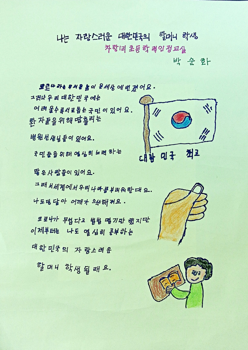 코로나 때문에 공부도 오랫동안 못했지만 서로 열심히 돕는 사람들이 많은 대한민국이 자랑스럽고 나도 자랑스러운 학생이 되겠다는 다짐을 시로 표현하였습니다.
