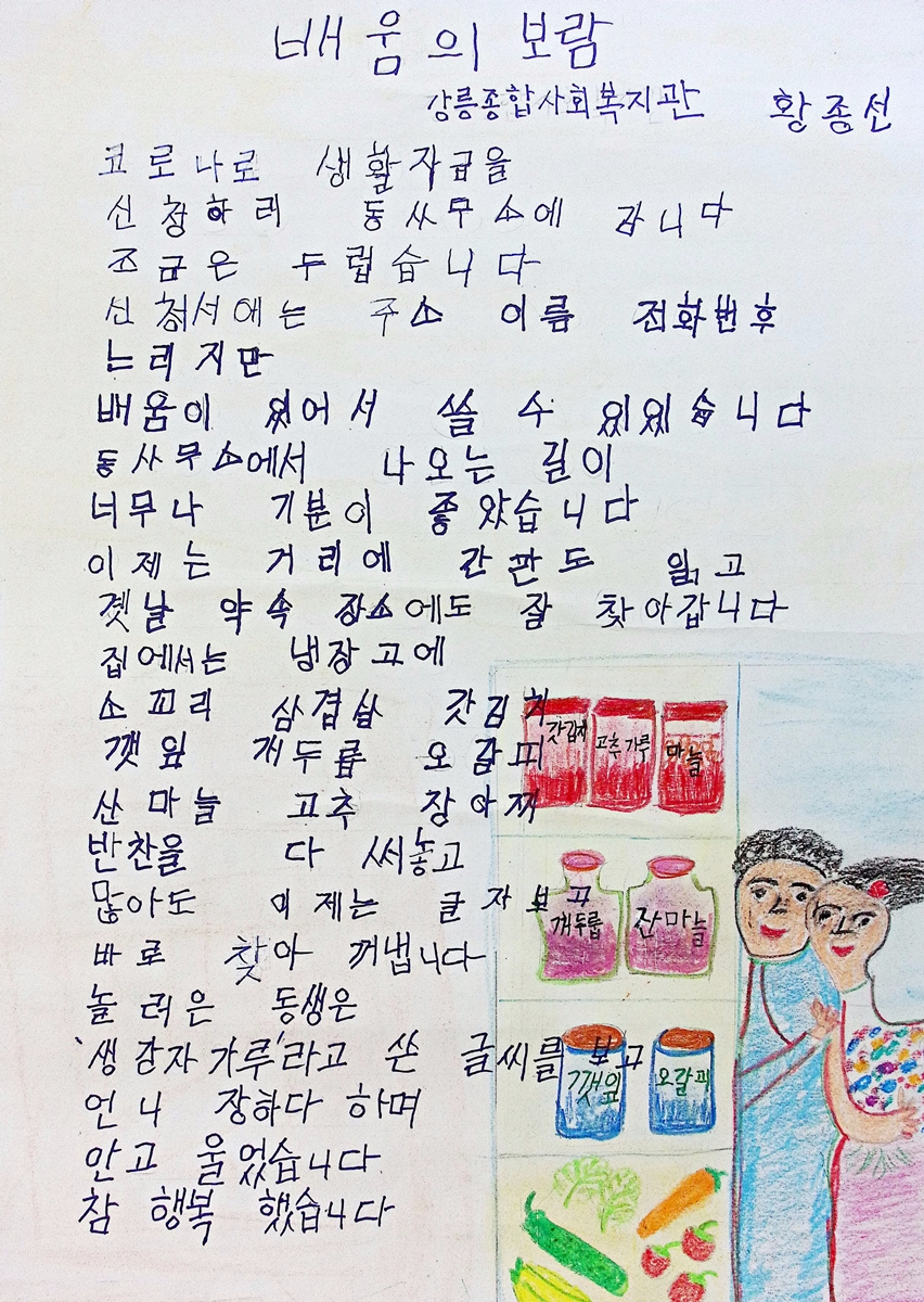 아무것도 모르던 나를 복지관 선생님, 한글 선생님이 신경써주시고 한글을 알려주시고 해서 덕분에 이름도 쓰고 길가에 간판도 읽게 되었습니다. 이렇게 상까지 타게 되니 놀랍고 고마운 마음을 어찌할 바 모르겠습니다. 감사합니다.