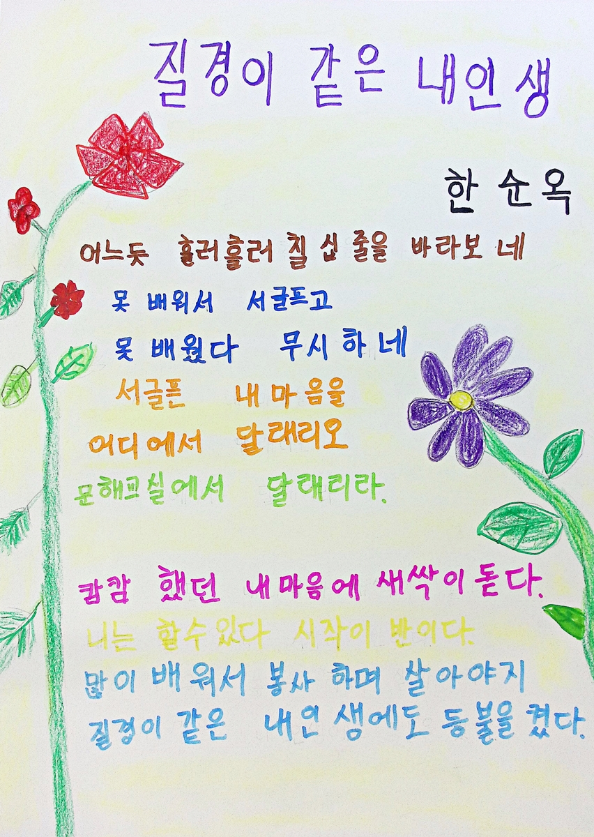 꿈그린한글학교에 입학하여 공부를 하다 보니 인생을 질경이처럼 모질게 살아왔다는 생각이 들어 질경이같은 내 인생을 시화로 표현하였습니다.