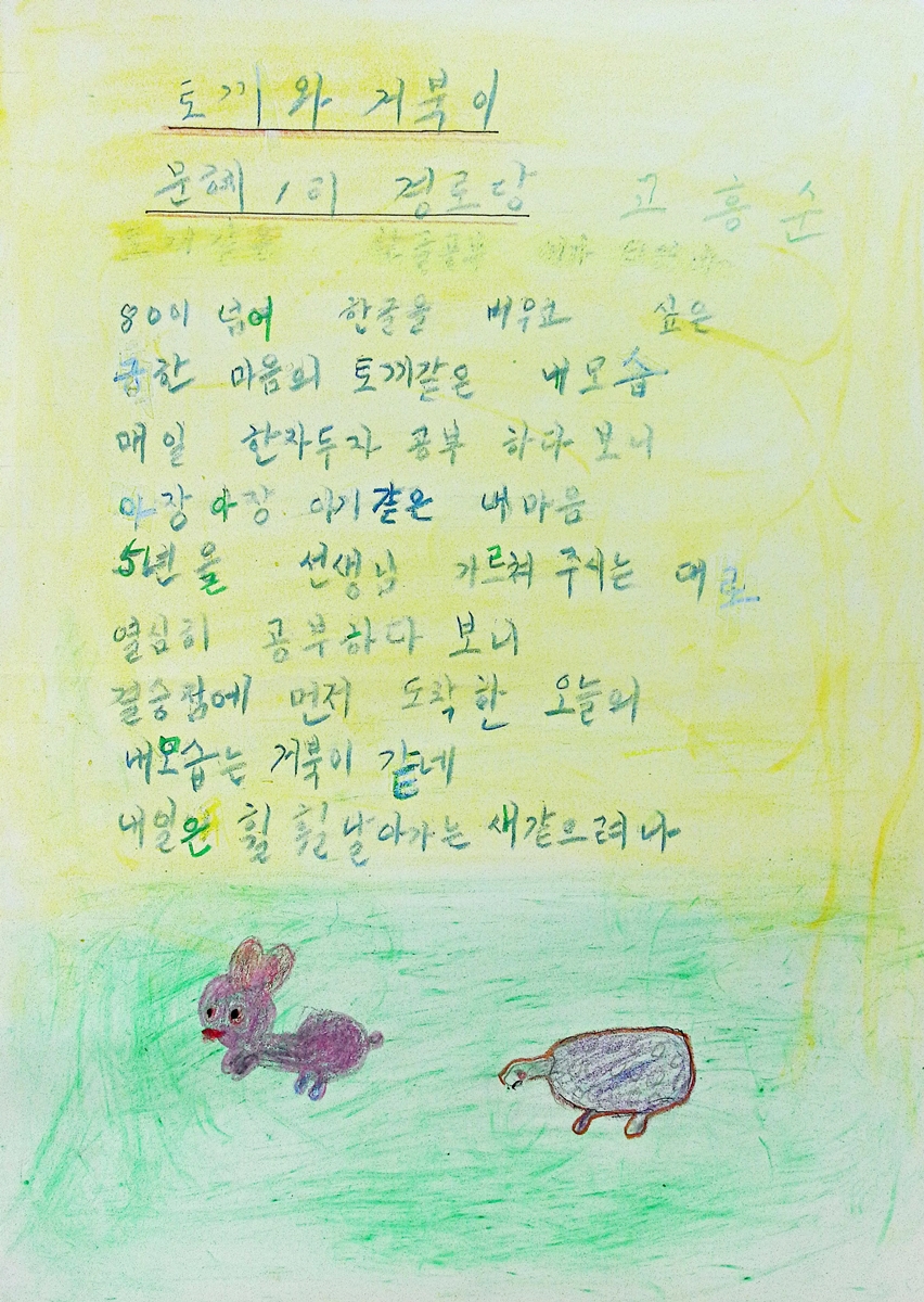 꾸준히 지속한 한글공부가 늦고 더디지만 승리한 거북이에 비유하고, 나아가 새처럼 비상하며 더 많이 알고 싶은 마음을 표현하였습니다.