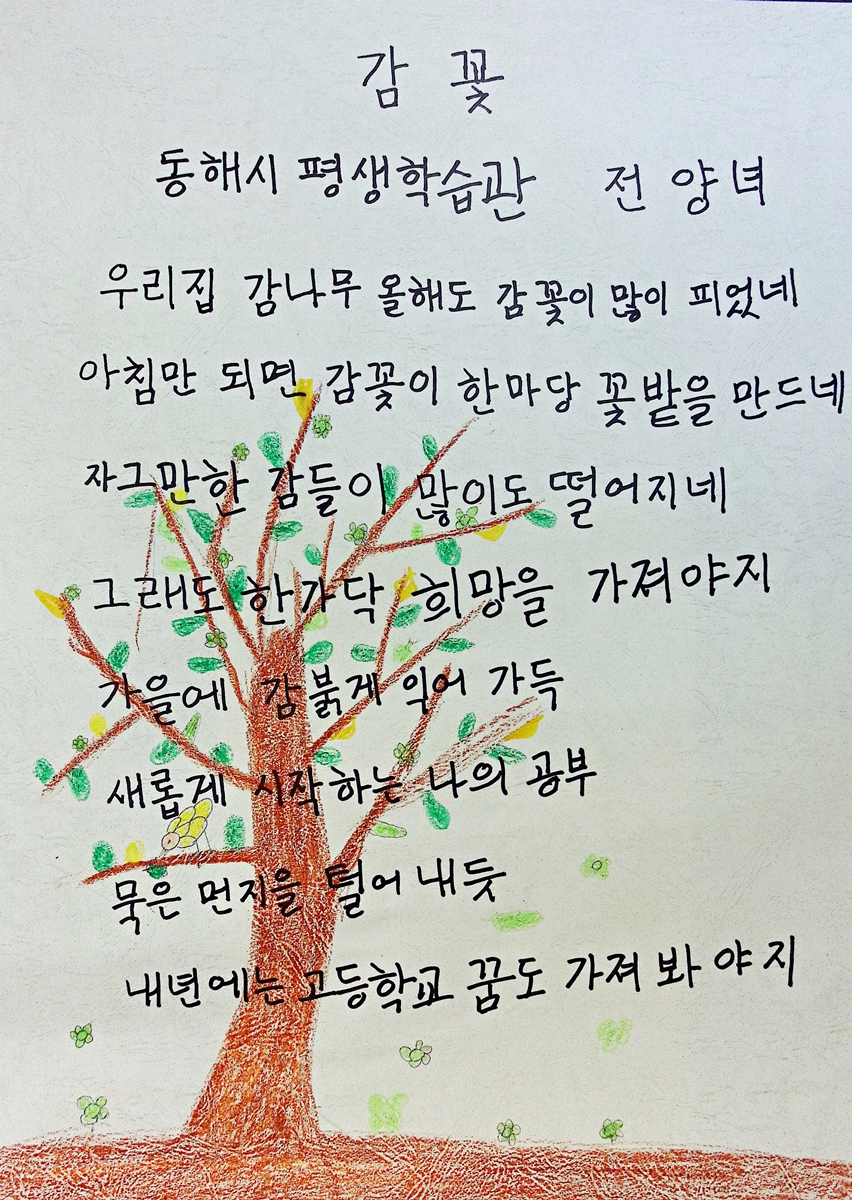그래도 감꽃이 떨어지고 나면 감이 열리고 그 감이 또 씨앗을 남기듯이 ‘나도 열심히 공부하다 보면 붉은 감처럼 달콤한 열매를 맺을 수 있지 않을까?’하는 마음에서 이 시를 쓰게 되었습니다.