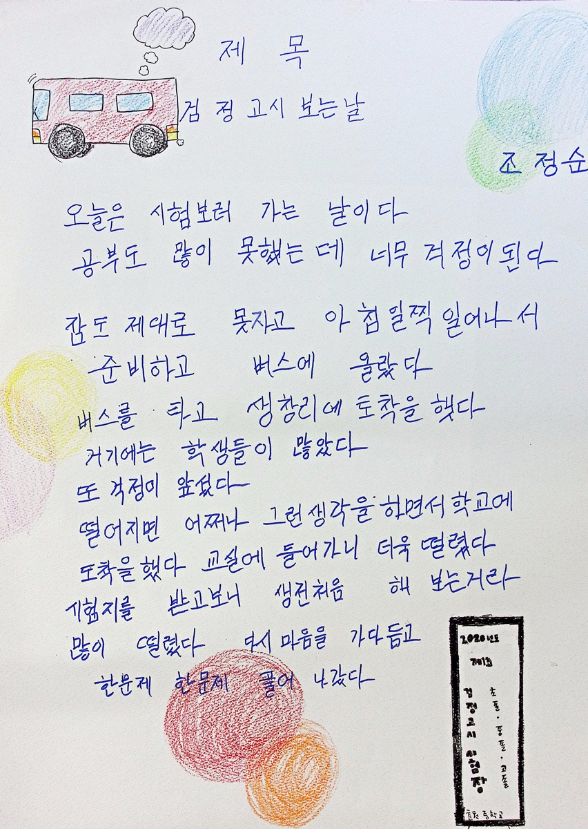 한글 공부를 배워서 초등 검정고시 보기까지 노력하고, 실제 보러 간 날 심정을 시화로 표현하였습니다.