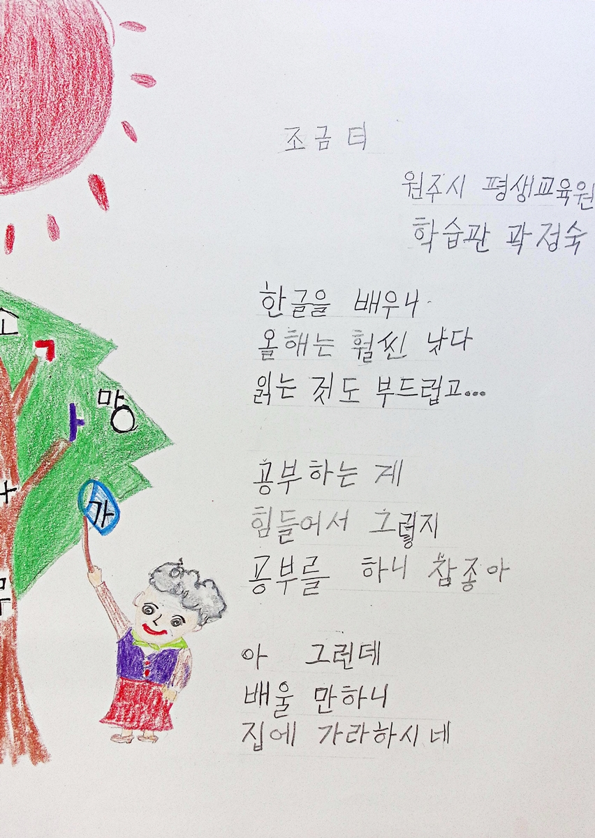 글자를 배워 자필로 아들에게 편지를 쓰게 된 것이 제일 큰 기쁨이며 학습관에서 글자공부에 열중하다보면 시간가는 줄 모르고 공부하는 시간이 너무 즐거워 조금 더 공부하고 싶은 마음을 담아 시화전으로 출품하였습니다.