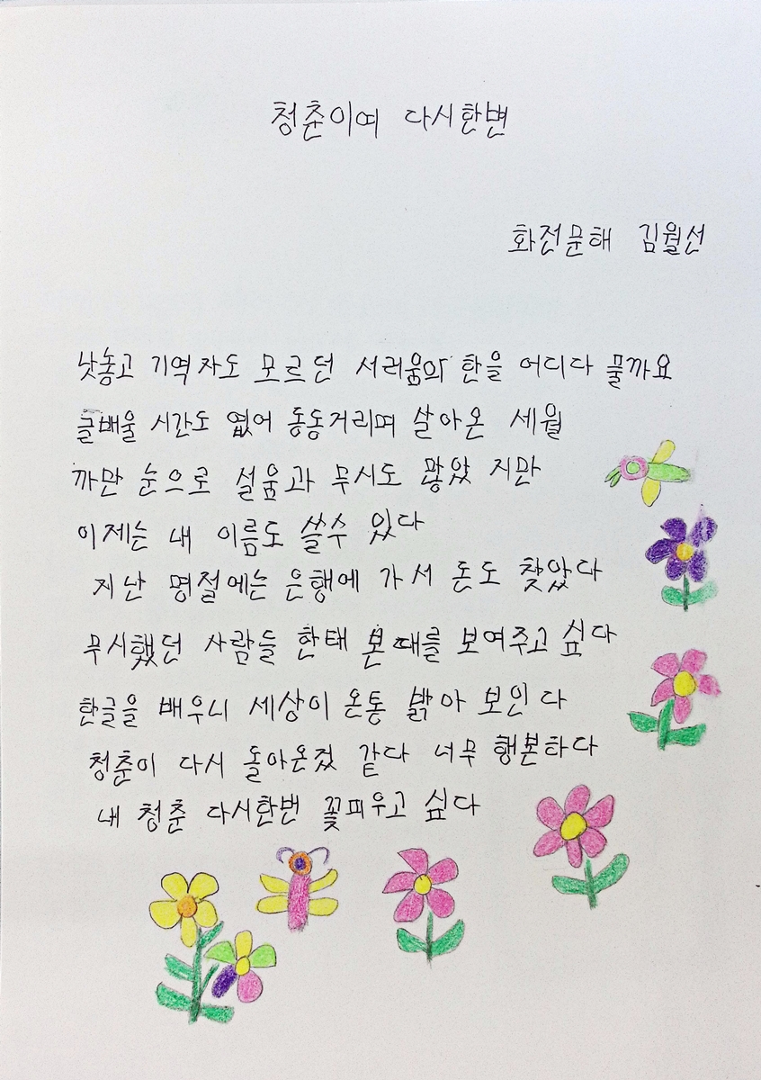 몸이 아파 병원을 찾았지만, 한글을 읽지 못해 푸대접을 받았습니다. 한글을 알았더라면..’ 하는 생각이 끊이지 않았고, 마음도 아파졌습니다. 그러다 경로당에서 한글을 알려준다는 소식을 듣고 부랴부랴 신청했고 한글을 읽고 쓸 줄 아는 내 자신이 대견하고 청춘이 다시 돌아온 것 같습니다.