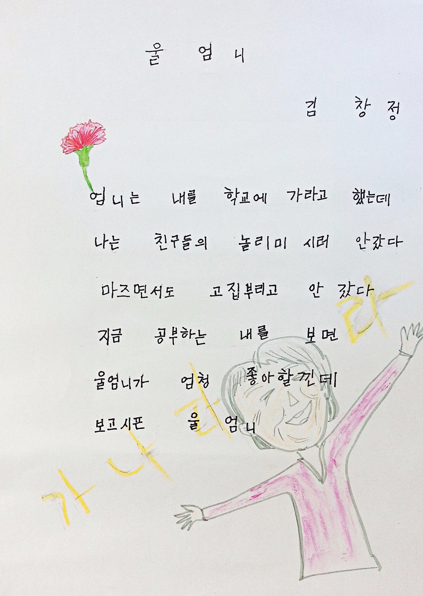친구들의 놀림이 싫어 학교에 가지 않던 학습자는 성인문해학습에 참여하며 공부를 하게 된 자신의 모습을 돌아가신 엄마가 자랑스러워 할 것이라는 생각을 하며 엄마를 그리워하는 마음을 작품으로 표현했습니다.