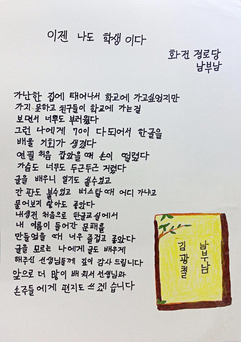 친구들이 학교에 가는걸 부러워만 했었는데, 나이 70에 공부를 시작했습니다. 간판도 읽고 일기도 쓰면서 나도 학생이 되었습니다.