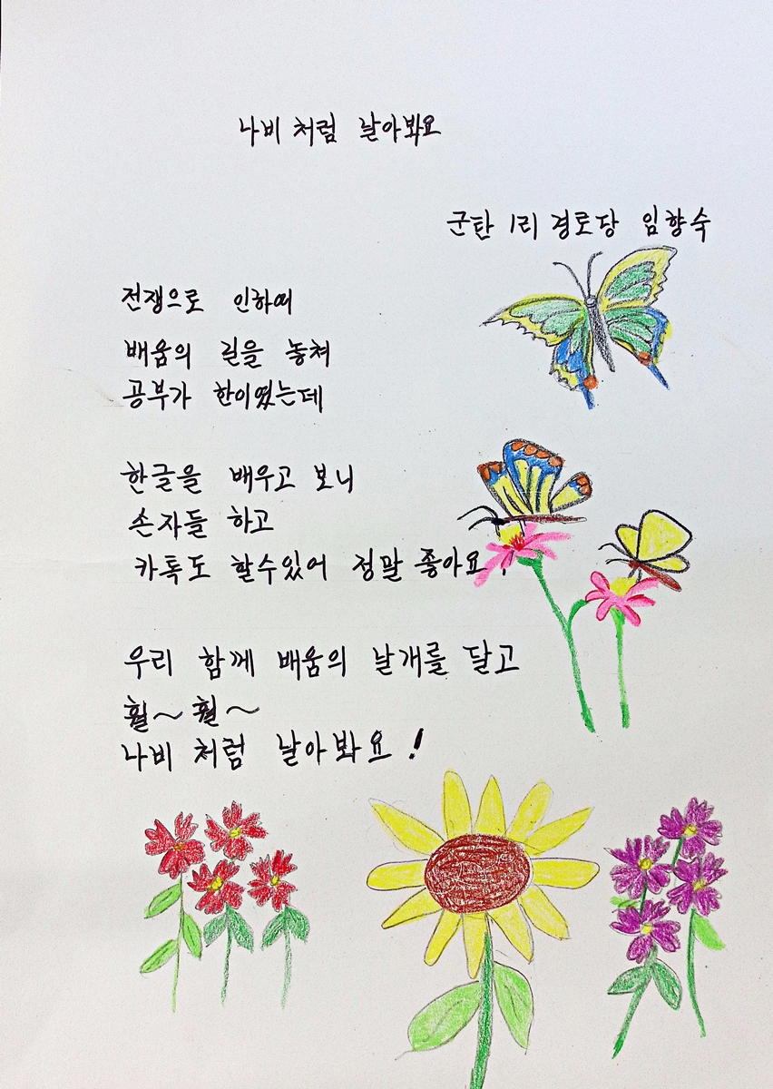 한글 공부로 인해 배움의 날개를 달고 나비처럼 훨훨 날고 싶은 마음 표현하였습니다.