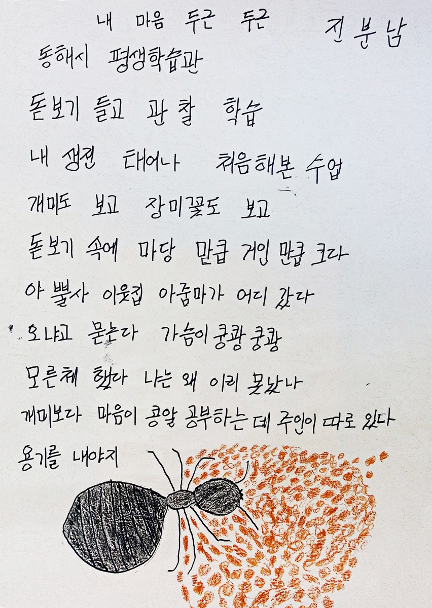 부모님께서 일찍 돌아가셔서 배우지 못한 한이 늘 가슴 한 구석에 자리 잡고 있었습니다. 지금은 그래도 평생학습관에서 한글을 배운 덕분에 지금은 자신감도 생기고 책도 읽을 수 있어 좋습니다.