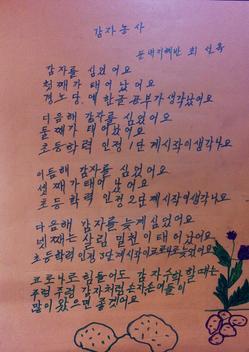 감자농사를 매년 했는데 그때마다 자식이 태어나서 힘이 들었습니다. 1년마다 한단계씩 공부해서 힘들게 올라온 생각을 했습니다. 공부도 하고 이제는 감자 수확에 매년 손자와 손녀들이 많이 왔으면 좋습니다.