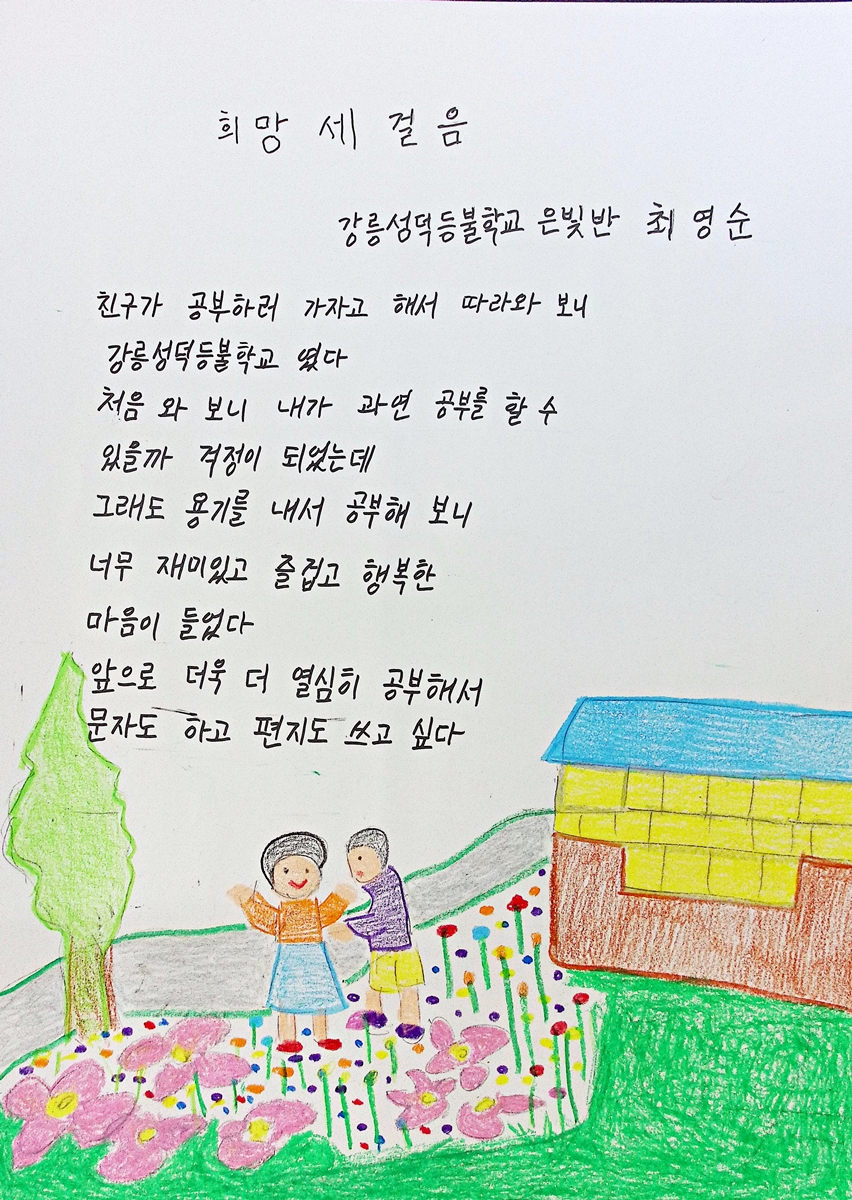 우연히 친구따라 성덕등블학교에 등록하여 2년이 되어 되어갑니다. 한글을 쓰고 읽을 줄 알아서 세상이 달라 보이고, 너무 기쁩니다. 교무부장님의 권유로 시화전에 나의 작품 희망 세 걸음을 출품하게 되어 기쁨니다.