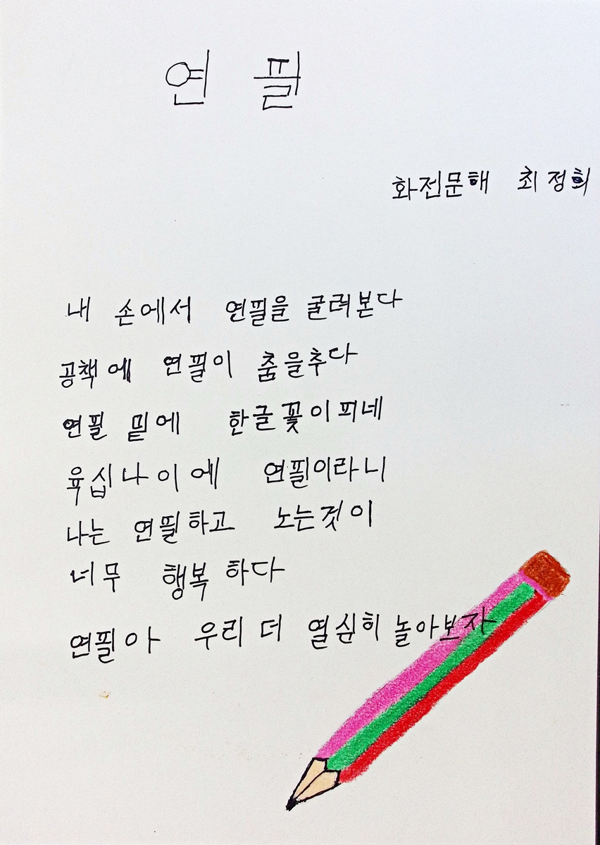 '친구따라 강남간다’ 친한 친구가 한글을 배운다고 같이 배우자고 했습니다. 한글을 배우러 갔더니 새로운 친구 연필이 생겼습니다. 앞으로 연필이랑 더 친해져야겠다는 마음을 시화로 표현하였습니다.