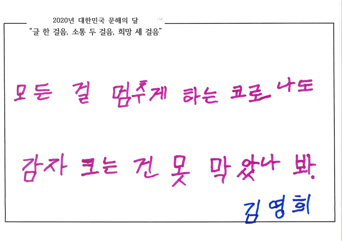 감자 농사를 짓고 있는 김영희 학습자는 감자 밭에 아기 감자가 달려있는 것을 보았습니다. 코로나는 학교도 여행도 못가게 하고, 일상을 멈추게 하는 줄 알았는데 그 속에서도 열심히 자라는 감자를 보며 희망을 갖게 되었습니다.