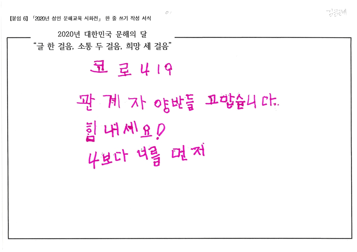 80이 넘도록 제 이름자도 못 쓰는 말못할 서러움만 간직하고 살다가 마을로 찾아와 한글을 가르쳐 주셔서 감사합니다. 그런데 배움의 기쁨도 잠시 코로나로 인해 공부를 못하는 시간이 아쉽기만 합니다.