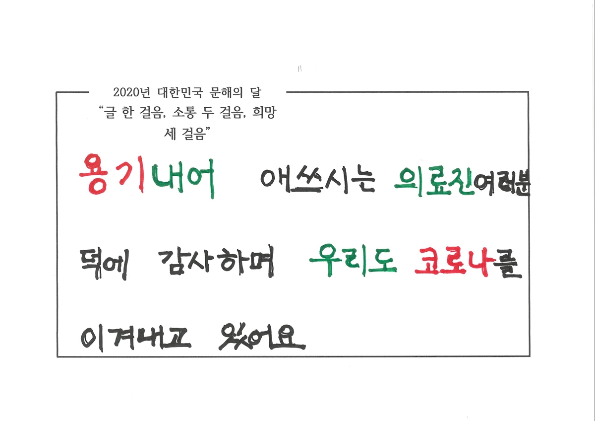 코로나로 힘든 의료진들에게 감사의 표현과 우리어르신들도 잘 이겨내라는 희망의 메시지를 표현하였습니다.