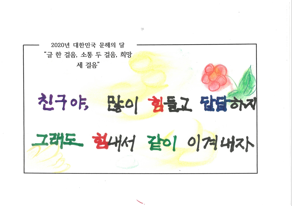 코로나로 인해 친구도 마음껏 못 만남을 친구의 답답함을 같이 이겨내자고 표현한 작품입니다.