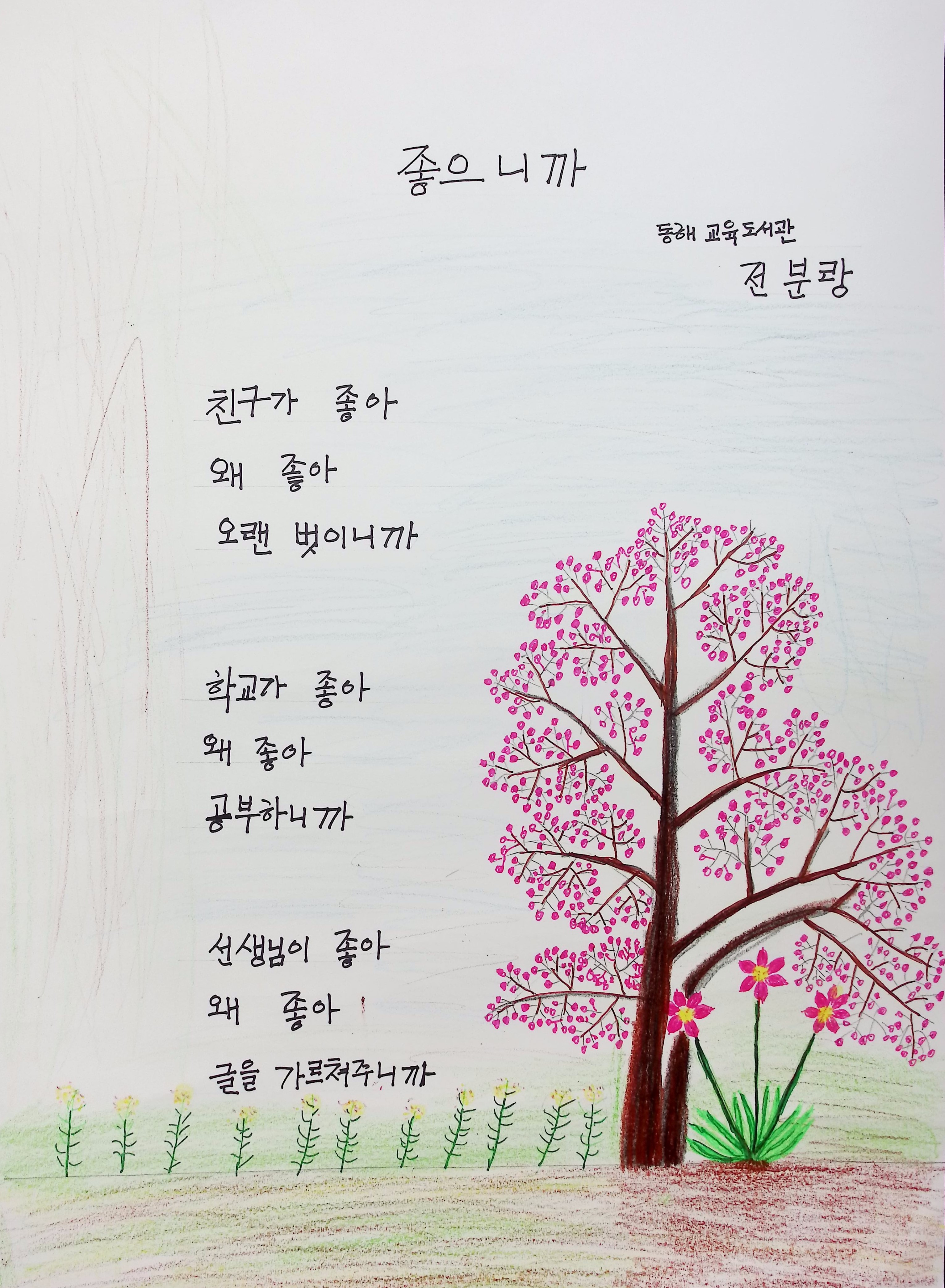 학습에 대한 열정이 남다르시다는 전분랑 학습자의 뛰어난 그림솜씨와 아름다운 글솜씨가 돋보이는 시화 작품입니다.