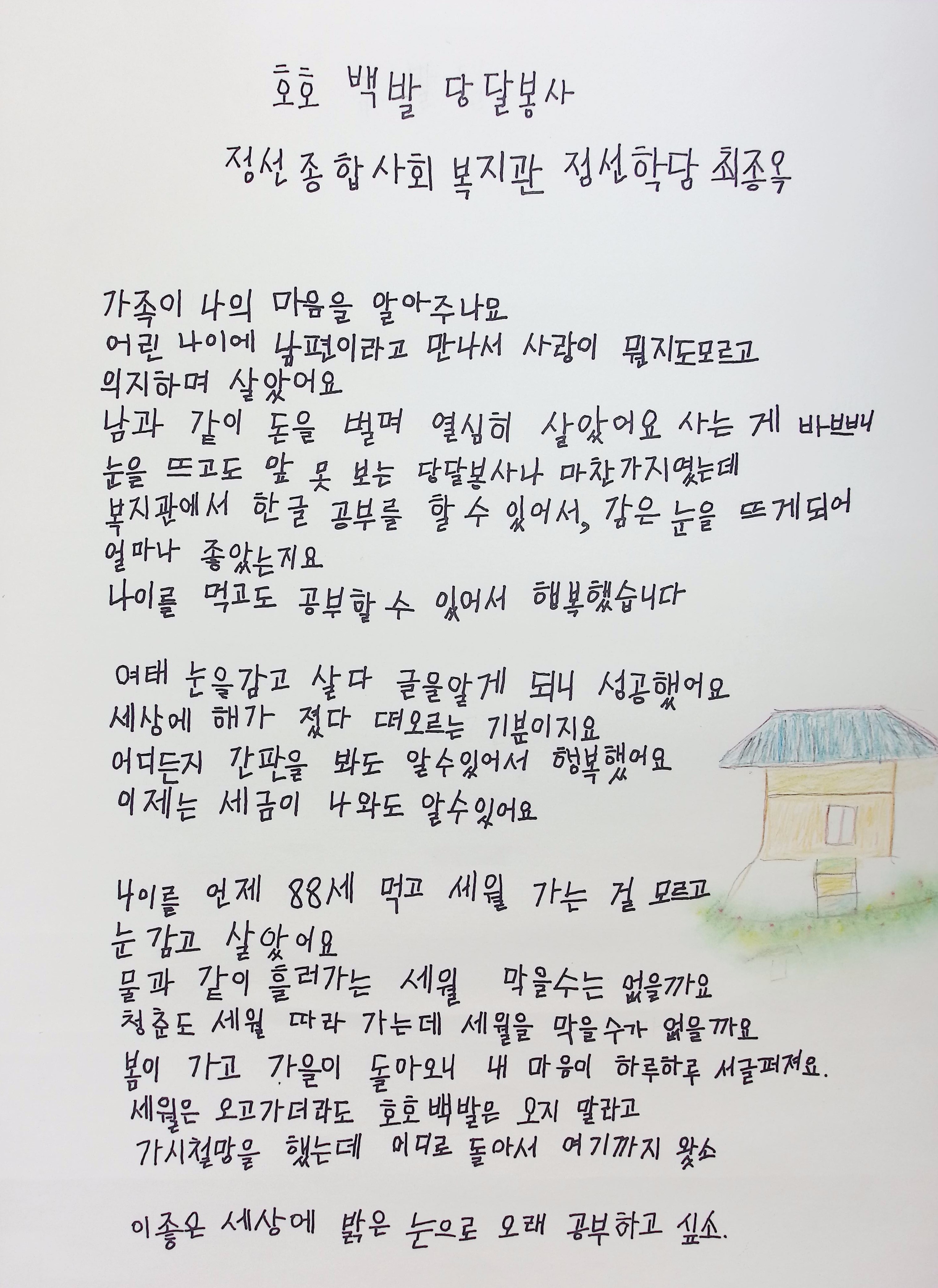 “참, 힘들었었지. 그 시절은.” 하고 미소 지으시는 최종옥 학습자입니다.