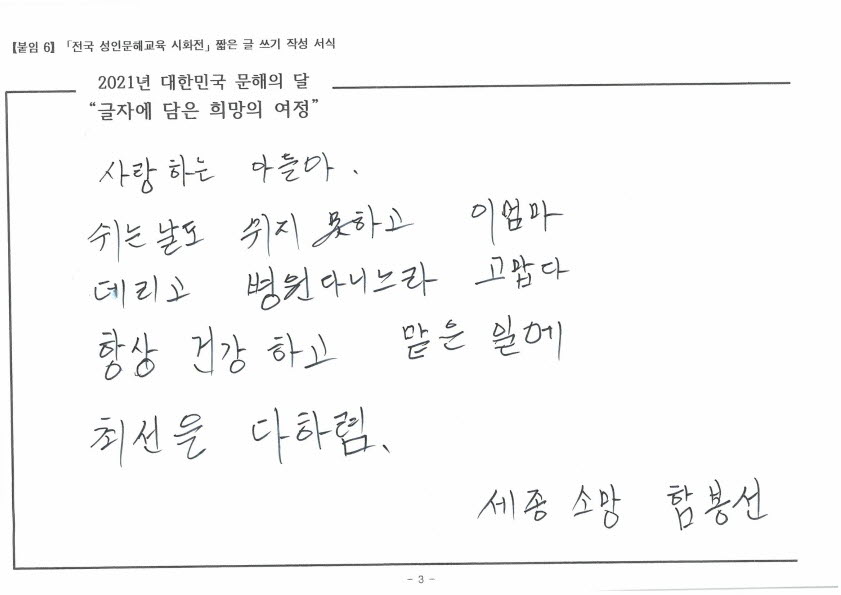 [한줄쓰기] 사랑하는 나의 아들_함봉선