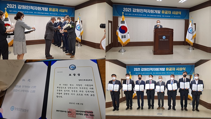 ▶ 강원인재육성재단이 강원도민일보와 강원도인적자원개발위원회가 시상하는 ‘2021 강원인적자원개발 유공자’ 수상기관으로 선정됐습니다. - 21년 10월 6일, 강원도민일보 대회의실