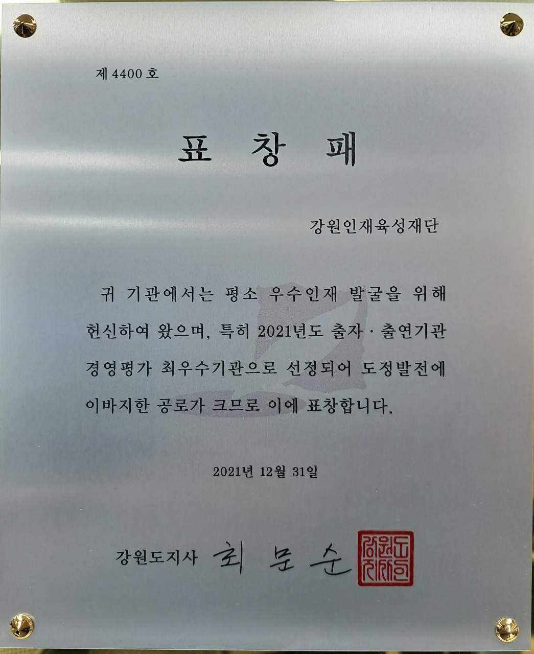 강원인재육성재단이 2021년 출자출연기관 경영평가 최우수기관으로 선정되었습니다.(2021. 12. 31)