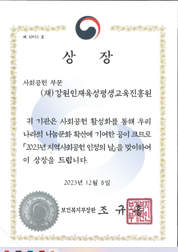 ○내용: 2023년도 지역사회공헌 인정제 인증패 수상 및 보건복지부 장관상 수상