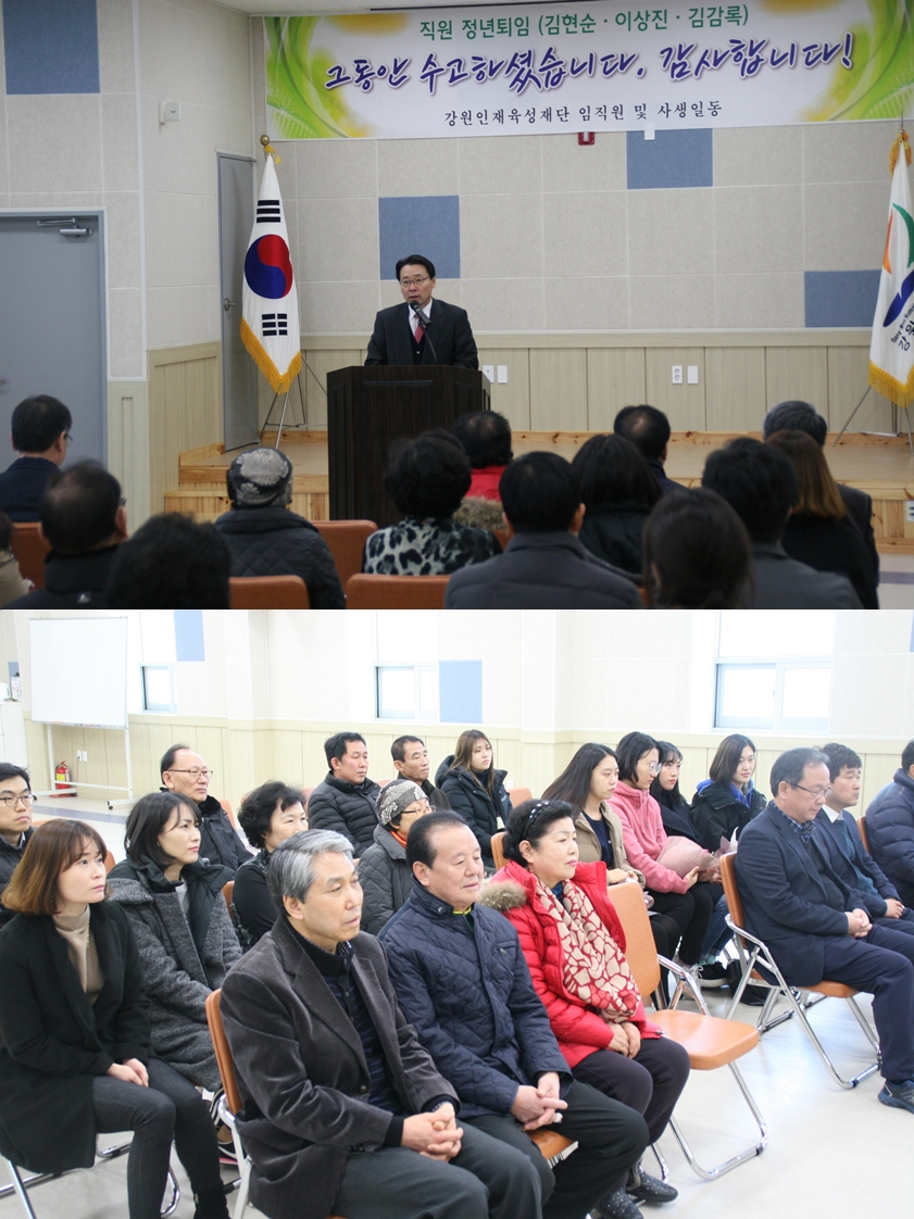 ▲ 직원(김현순·이상진·김감록) 정년퇴임식이 12월 29일 김정삼 상임이사님과 진성영 사무처장님 그리고 재단 직원과 자치회 학생들이 참석한 가운데 진행됐습니다. 나가시는 세 분의 앞날에 건강과 행복이 가득하기를 바랍니다.