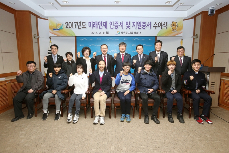 ▲ 배진환 행정부지사, 김동일 강원도의회 의장, 김정삼 강원인재육성재단 상임이사를 비롯해 많은 내빈이 참석하여 2017년 강원미래인재들과 함께 기념촬영을 하고 있다.