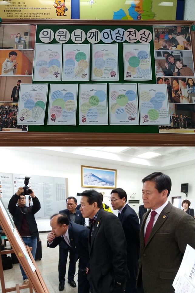 ▲ 도의원분들께 고향의 후배 사생들이 롤링페이퍼에 메세지를 담아 선물하였습니다