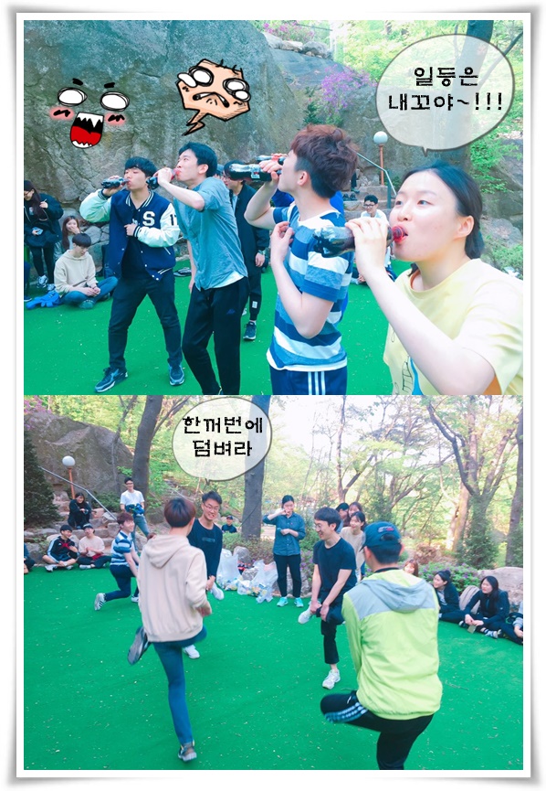 ▲ 레크레이션 시간에 실시한 <콜라 빨리마시기>와 <닭싸움>