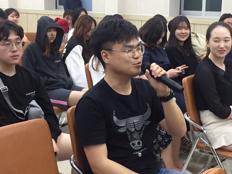▶ <숙우멘토단 사생 진로 취업지원 간담회>가 5월 9일(목) 저녁 8시에 미래관에서 열렸습니다. 질문하고 있는 학생은 유형준 사생(율곡관 401호)