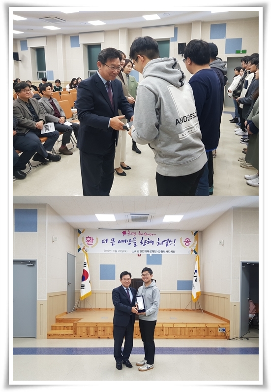 ▶ 졸업기념품을 직접 전달하는 윤성보 원장님(왼쪽)과 공로패를 수상한 김상현(오른쪽) 자치회장(19. 11. 28)