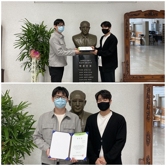 2021년도 자치회장 선거(4.2 ~ 4.4) 결과 당선된 심준보 사생에게 권순욱 선거관리위원장이 당선증을 수여하였습니다.(2021. 4. 6)