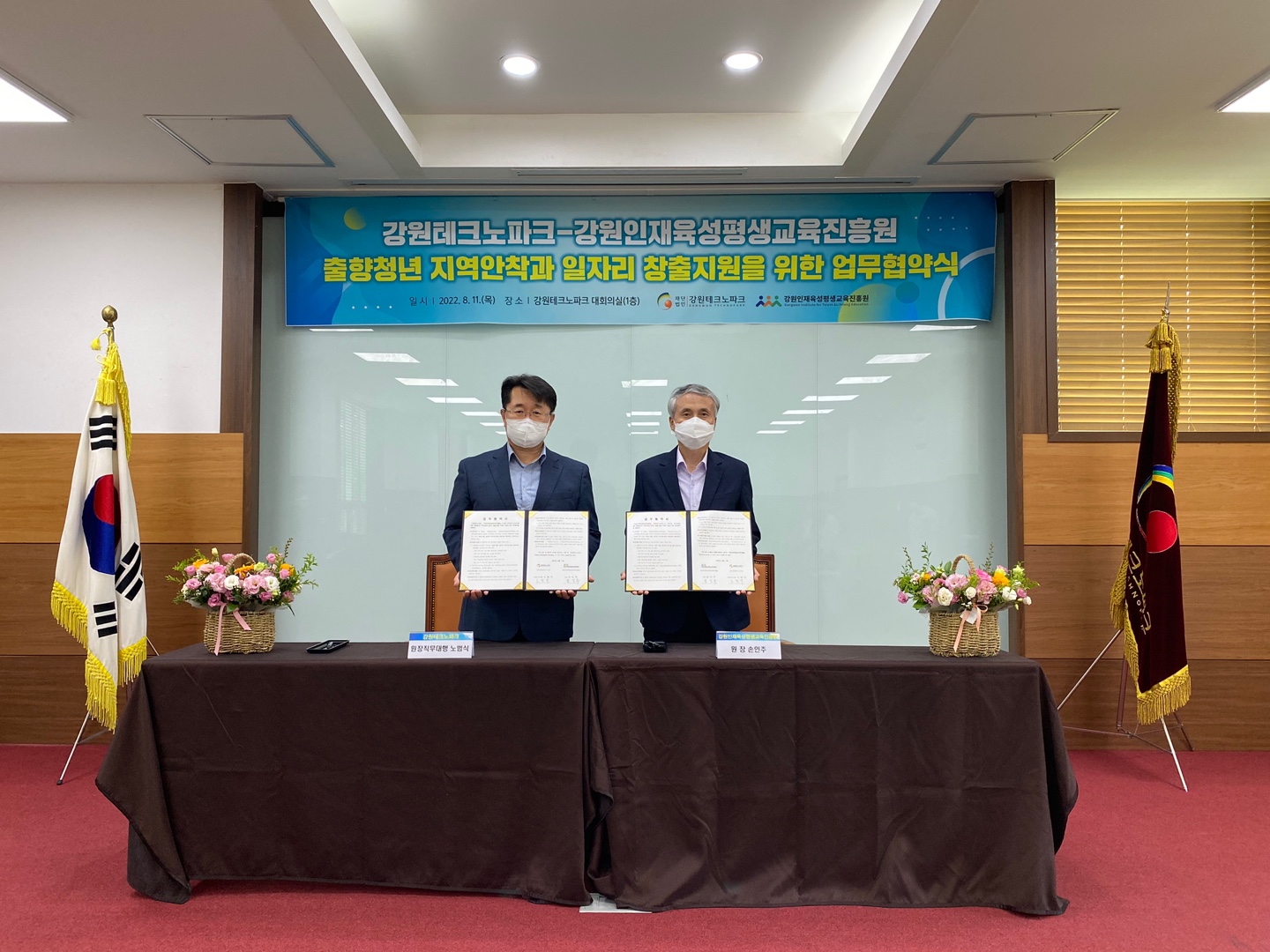 강원테크노파크(이하 강원TP)와 강원인재육성평생교육진흥원(이하 진흥원)이 강원학사생들의 지역기업 인식개선과 취업지원을 위해 ‘출향청년의 지역안착과 일자리 창출지원을 위한 업무협약’을 체결했다.11일 강원테크노파크 대회의실에서 열린 이번 협약식에는 노범식 강원TP 원장직무대행과 손인주 진흥원 원장을 비롯해 양 기관 관계자 10여명이 참석했다. 양 기관은 향후 출향청년의 지역귀환과 청년일자리 창출지원을 위한 다양한 협력사업을 추진할 계획이다. 협약을 통해 △강원지역 우수기업 탐방을 위한 참여기업, 출향청년 모집 △강원지역 우수기업 취업연계를 위한 협력 △산업부 주최 희망이음 경진대회 참여를 위한 협력 △각종 협력사업 운영을 활용한 양자간 다양한 매체 홍보 △사업추진 후 우수사례 도출 및 성과확산 △우수인재 지역기업 취업지원을 위한 양 기관간 네트워크 활성화 등에 협력하기로 했다.< 출처 : http://www.kado.net/news/articleView.html?idxno=1139634 >