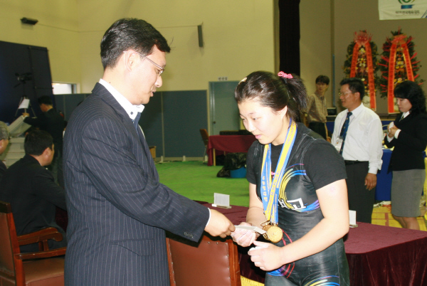 2006 전국체전에서 3관왕을 차지한 김보라양을 격려하는 김진섭 재단사무처장