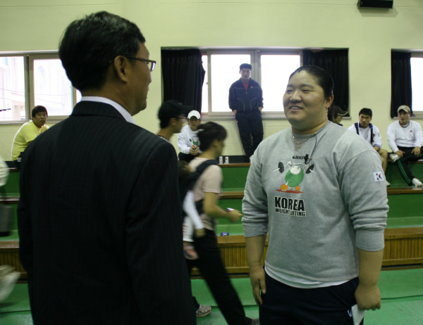 전국체전에서 3관왕을 차지한 장미란양 격려