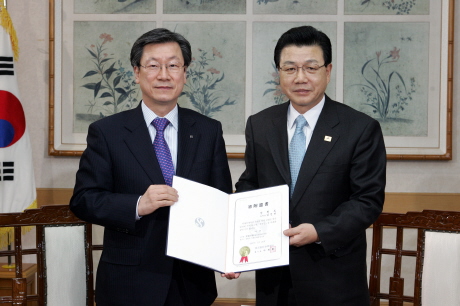 지난 1.26, 신한은행 문창성 부행장이 김진선이사장(강원도지사)를 예방하고 미래인재육성기금 1억원을 기탁했다