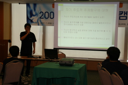 미래인재 과학캠프에 참가한 후배들에게 자기주도적 탐구할동에 대해 강의하는 심규석군(카이스트 1)