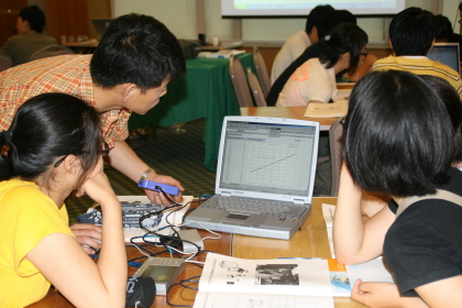 과학캠프에 참가한 도내 중등 과학영재들이 지도교사와 함께 컴퓨터 기반 실험(MBL) 물리 실험을 하고 있다.