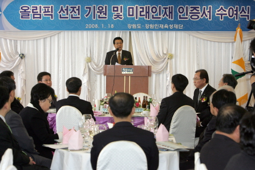 올림픽선전기원 및 미래인재인증서 수여식에서 격려사를 하고 있는 김진선이사장(강원도지사)