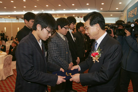 김진선 이사장(강원도지사)이 2008년 선발 미래인재 18명에게 인증서를 수여하는 모습