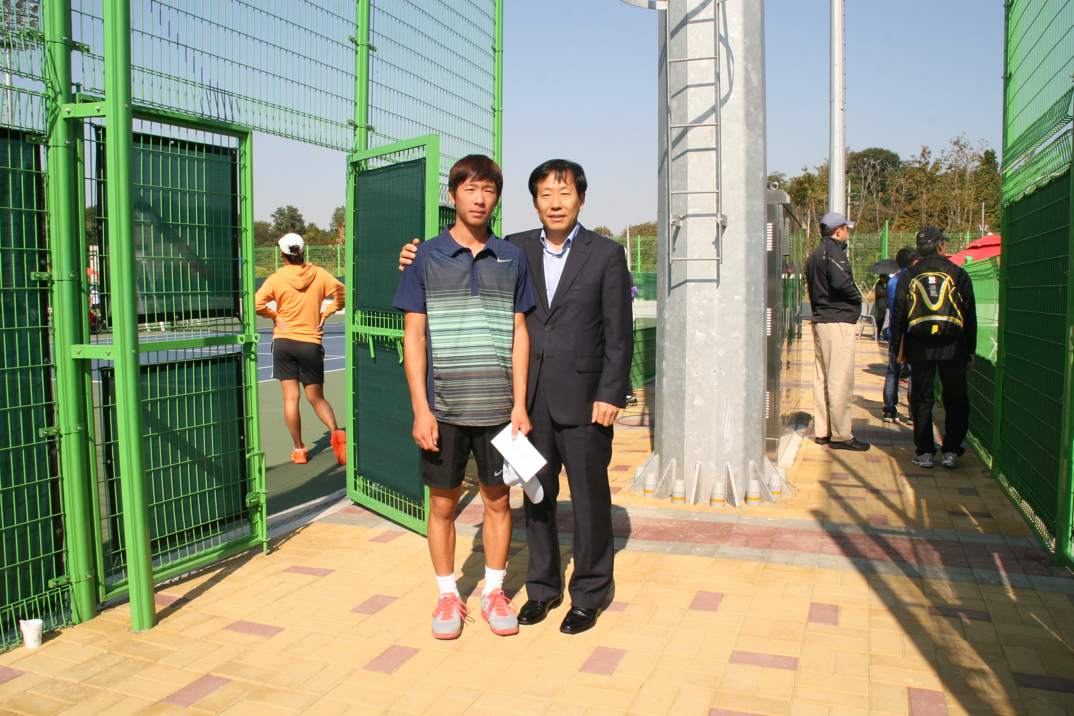 재단 함석근상임이사님께서 테니스 강원도 대표로 제94회 전국체전에 출전하는 홍성찬군의 경기장을 방문하여 선전을 기원하고 격려금 30만원을 전달하였다.