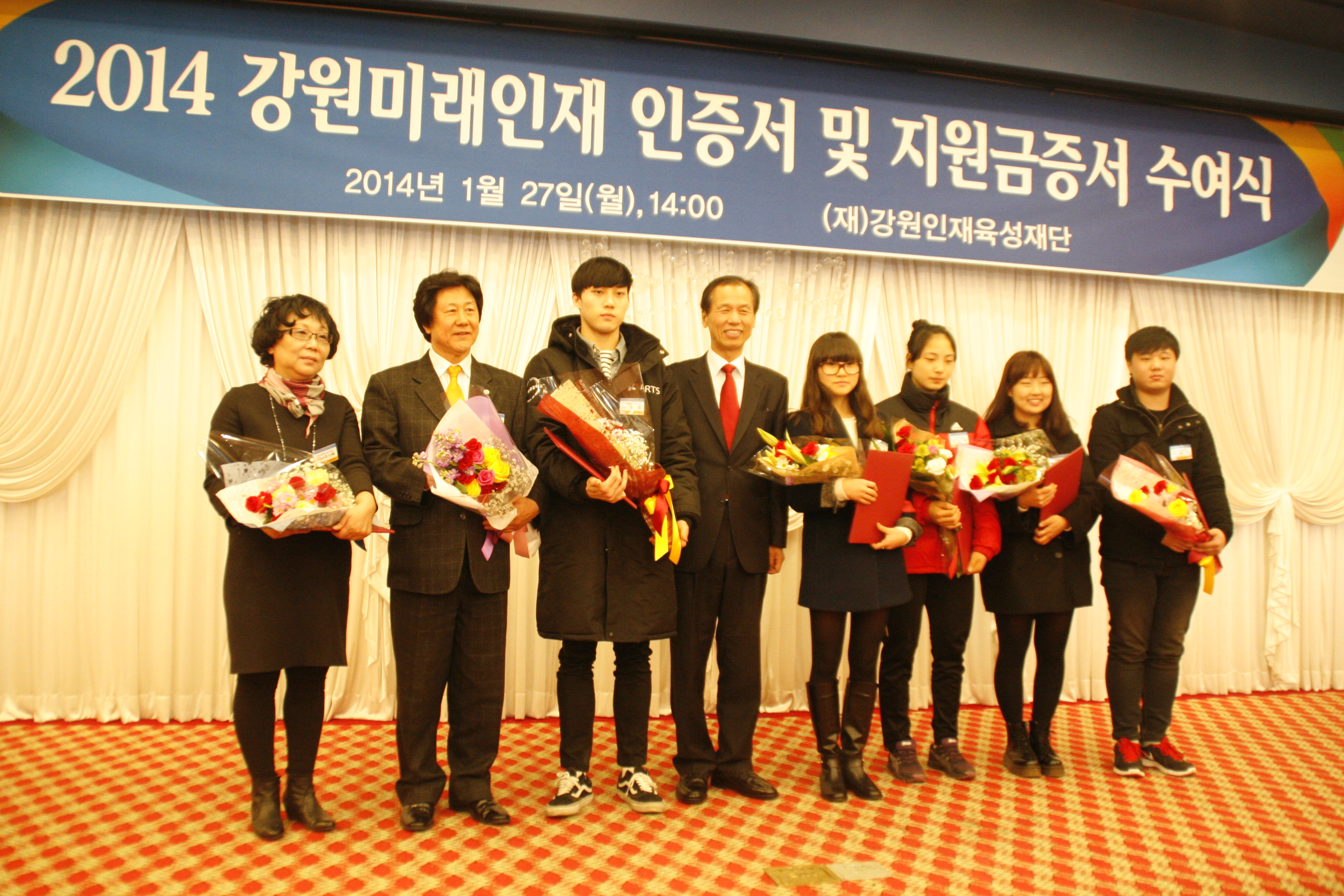2014 강원미래인재 인증서 수여식이 2014. 1. 27(월) 춘천 베어스관광호텔 소양홀에서 개최되었다. (재단이사장님과 2014 신규선발 미래인재 및 가족)