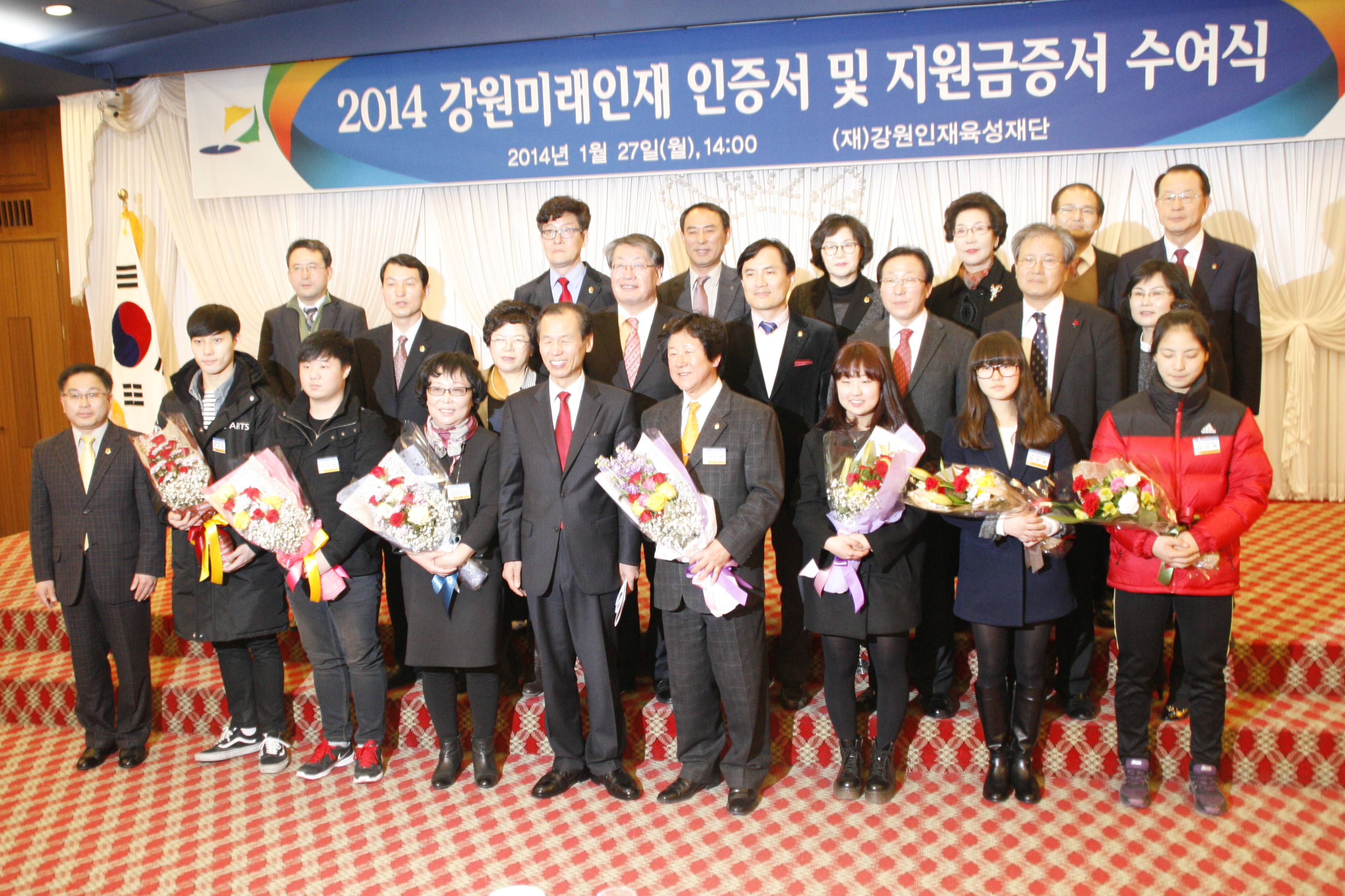 2014 강원미래인재 인증서 및 지원금증서 수여식이 2014. 1. 27(월) 춘천 베어스관광호텔 소양홀에서 개최되었다. (재단이사장님과 주요내빈,2014 신규선발 미래인재)
