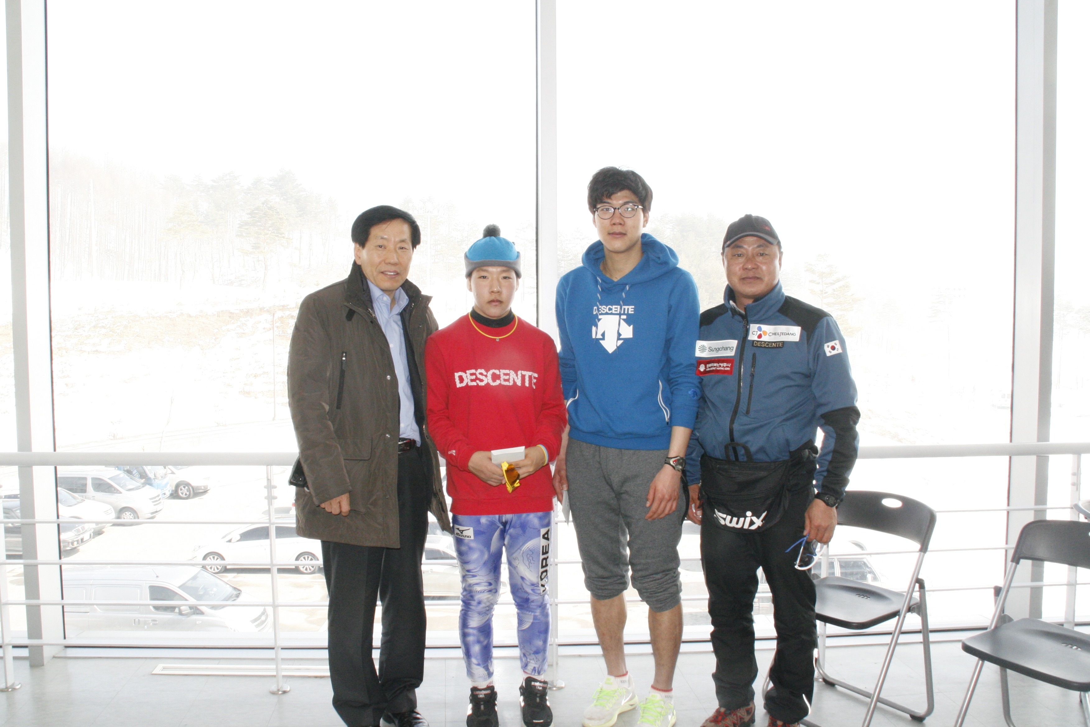 재단 함석근상임이사님께서 크로스컨트리 강원도 대표로 제95회 동계체전에 출전하는 박제언군과 김민우군을 방문하여 선전을 기원하고 격려금 30만원을 전달하였다.
