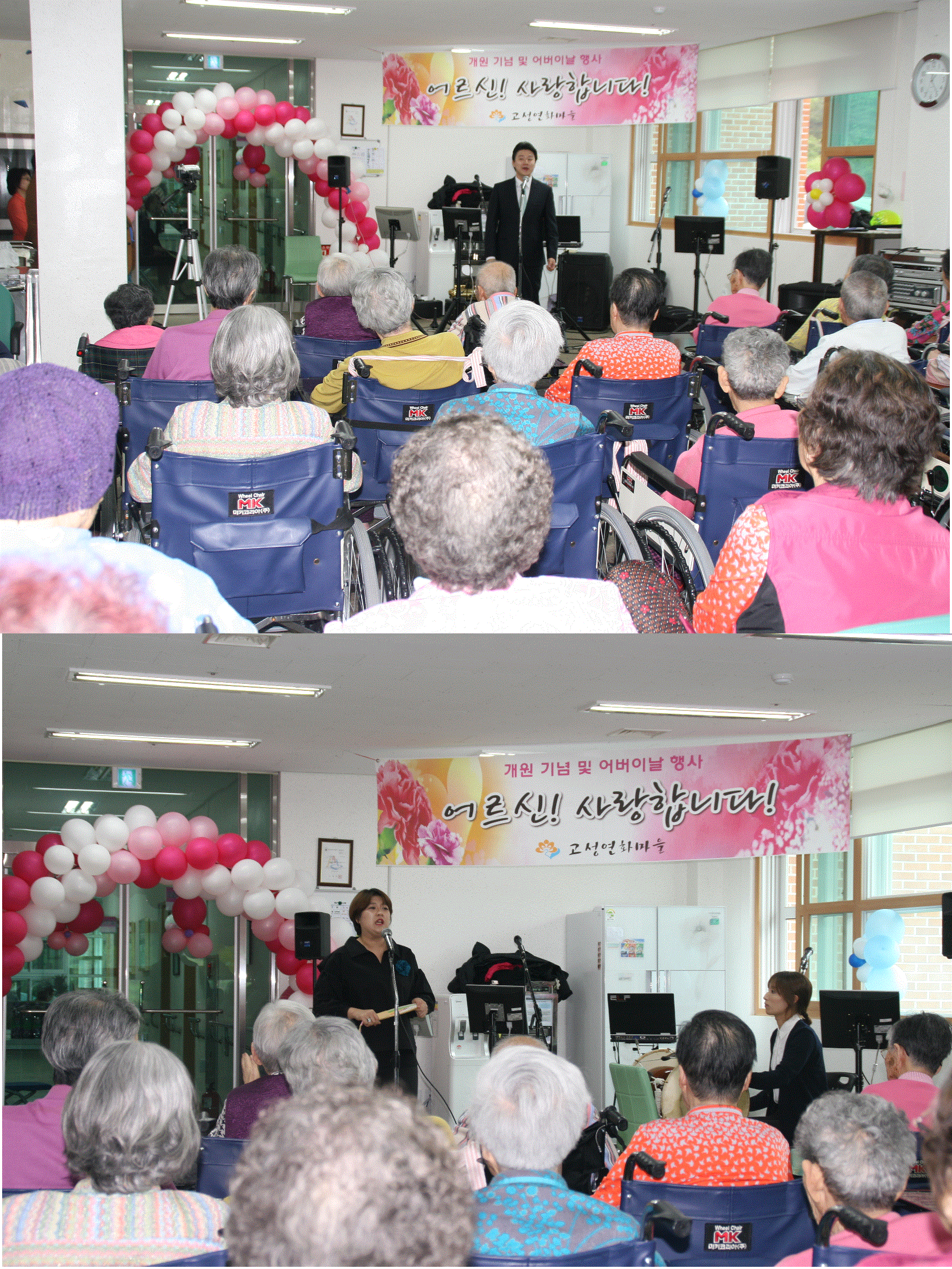2014. 5. 8(목), 강원미래인재 조민규(24세, 서울대 음악대학원 2년)군과 김솔지(27세, 북새통소속)씨가 고성군 간승읍에 위치한 노인요양시설인「고성연화마을」에서 어버이날 문화공연을 펼쳤다. 이날 공연에 참석한 70여명의 어르신들은 강원미래인재의 문화공연에 큰 박수로 화답하며, 즐거운 시간을 보냈다.