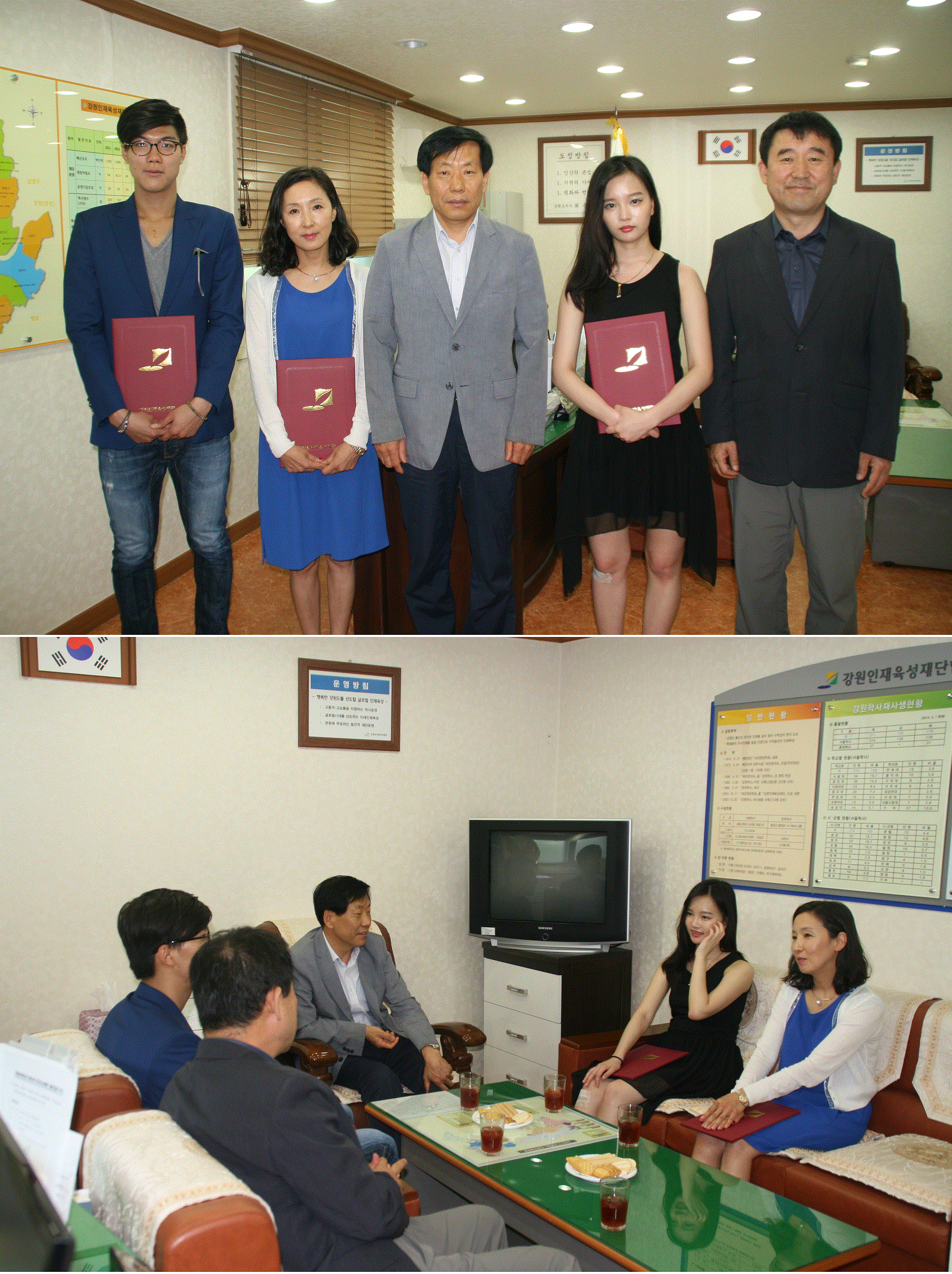 2014. 5. 29(목) 오후 3시에 서울 관악구 난곡동에 위치한 강원인재육성재단 상임이사실에서 2014 상반기 미래인재 지원금증서 수여식이 개최되었으며, 이 자리에는 재단 상임이사 함석근, 사무처장 김기찬, 체육분야 김석군의 어머님과 박제언군, 문화예술분야 김보원양이 참석하였다.