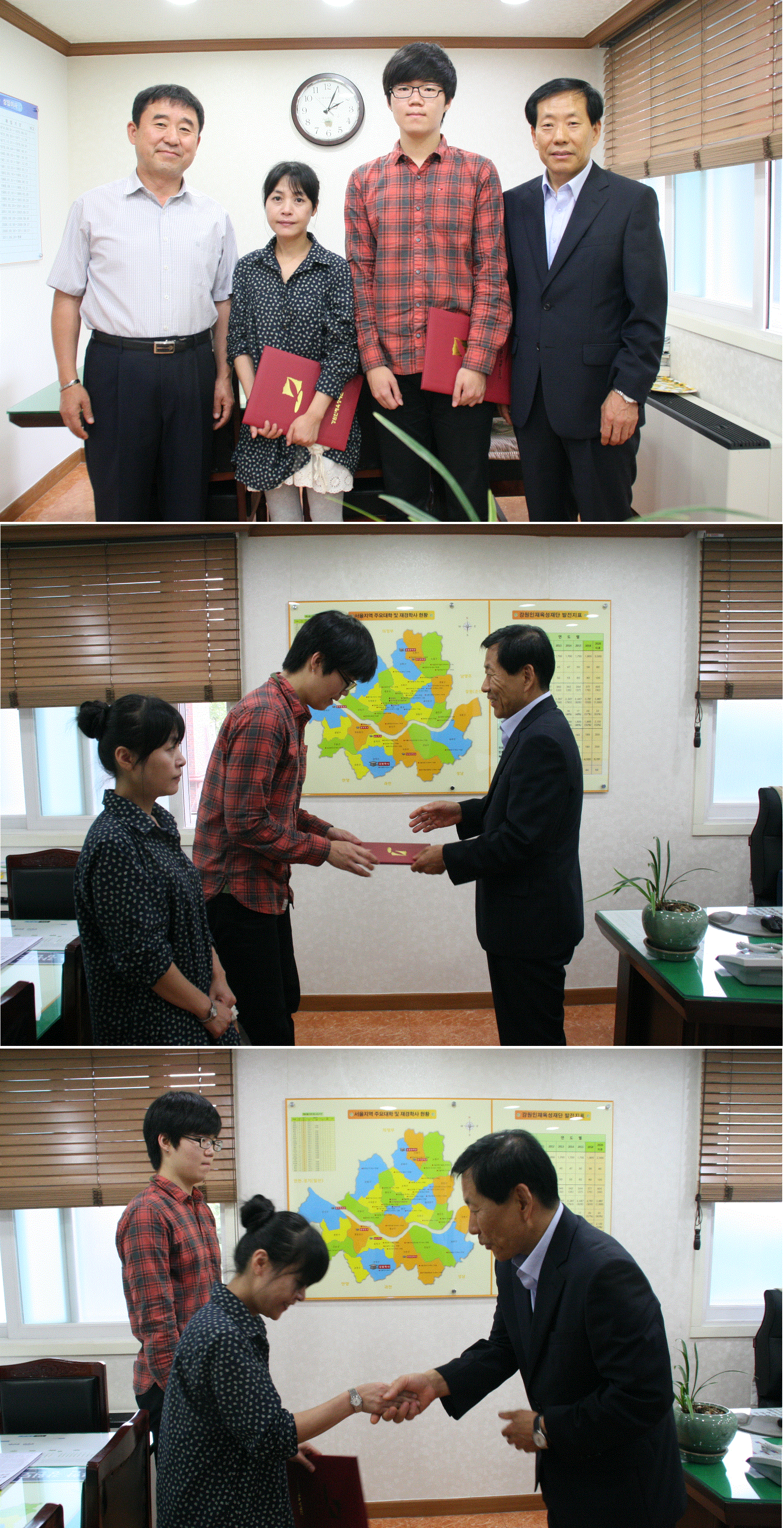 2014. 9. 26(금), 오후 2시, 서울 관악구 난곡동에 위치한 재단 사무실에서 2014년도 하반기 미래인재 지원금 수여식이 개최되었다. 이번 수여식은 지난 8월 지원금 수여식에 학업 일정 등으로 참석하지 못한 정준학생과 양예진학생에게 함석근 상임이사님께서 지원금증서를 수여하였다.